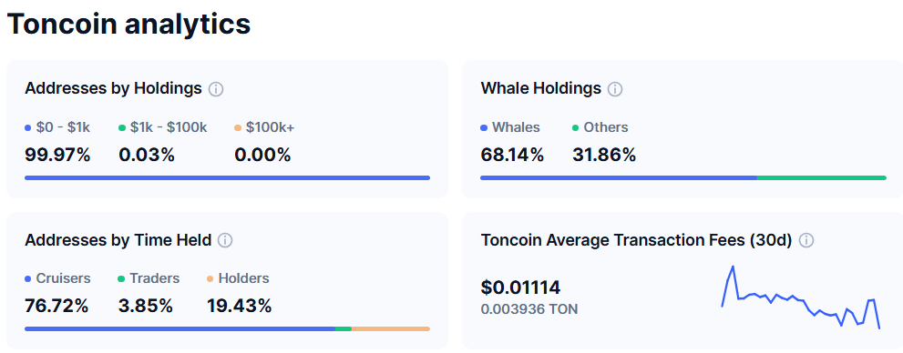 «CoinMarketCap» ma’lumotlariga ko’ra, Toncoinning umumiy ta’minotining 68% dan ortig’i katta miqdordagi tokenlarga ega bo’lgan «kit» hamyonlarida saqlanadi. Ushbu nomutanosib taqsimot narxning o’zgaruvchanligi xavfini oshiradi, chunki yirik egalar tomonidan amalga oshiriladigan katta miqdordagi savdolar narxga ta’sir qilishi mumkin.