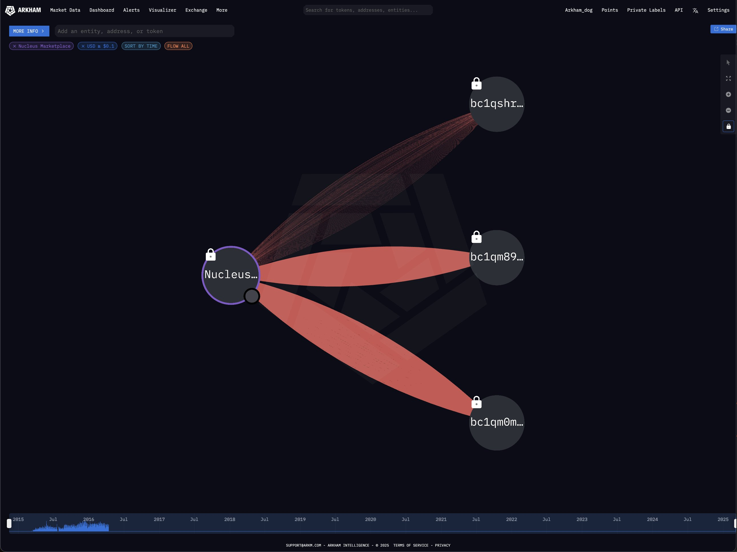 Arkham Intelligence Nucleus Marketplace, to’qqiz yil davomida butunlay faol bo’lmagan qorong’u veb giyohvandlik bozoridan katta Bitcoin tranzaksiyasini aniqladi. Nucleus uchta hamyonga 77,5 million dollar o’tkazdi, 365 million dollarni esa qoldirdi.