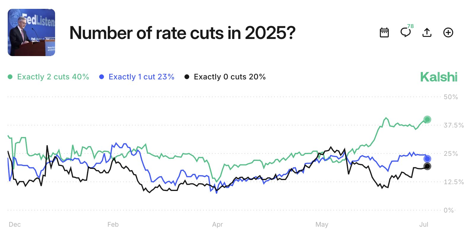 Ayni paytda, «Kalshi» (bashorat bozori) bozorida savdogarlar yil oxirigacha ikki marta pasayish ehtimolini 40% deb ko’rishmoqda.