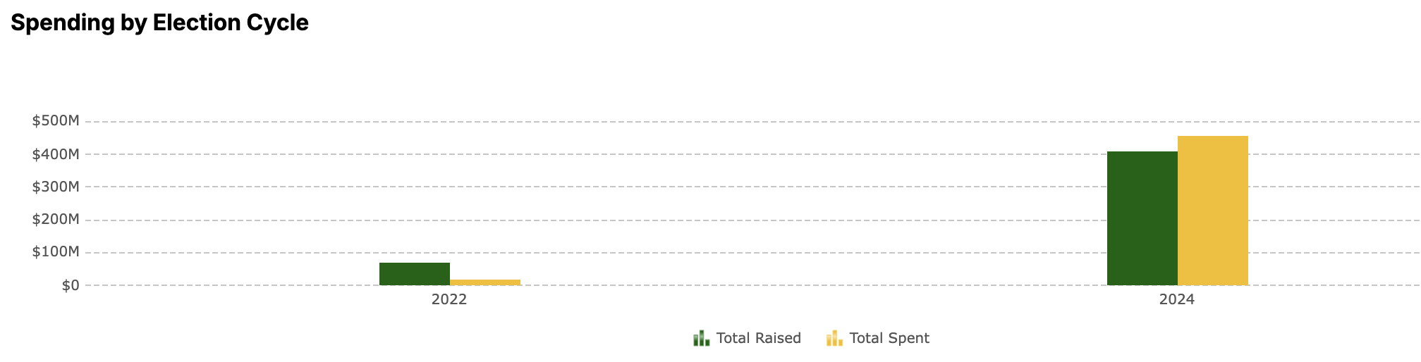 Bu guruhning barcha vaqtlar uchun rekord ko‘rsatkichi ekanligi xabar qilingan, lekin bu texnik jihatdan. «Make America Great Again Inc.», huquqiy jihatdan alohida, lekin bir xil odamlar tomonidan boshqariladigan tashkilot, 2024-yilgi saylovda 450 million dollardan ortiq mablag‘ yig‘di va sarfladi.