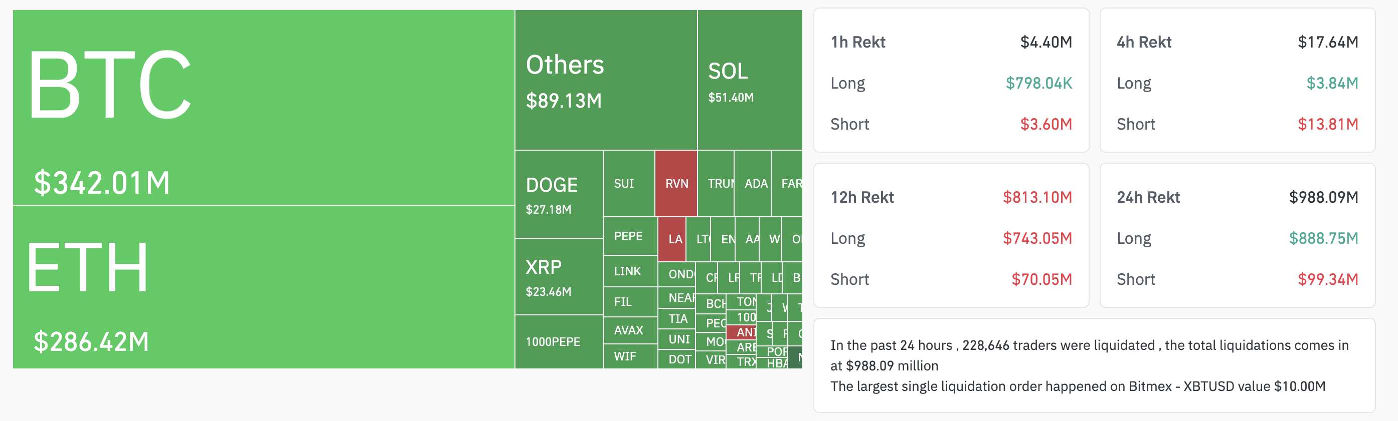 Bu narx pasayishi likvidatsiyalar to’lqinini keltirib chiqardi, chunki ko’plab qarzga olingan pozitsiyalar yopilishi kerak bo’ldi, bu esa o’zgaruvchanlikni kuchaytirdi. «Coinglass» ma’lumotlariga ko’ra, so’nggi 24 soat ichida umumiy likvidatsiyalar 988.09 million dollarga yetdi.
