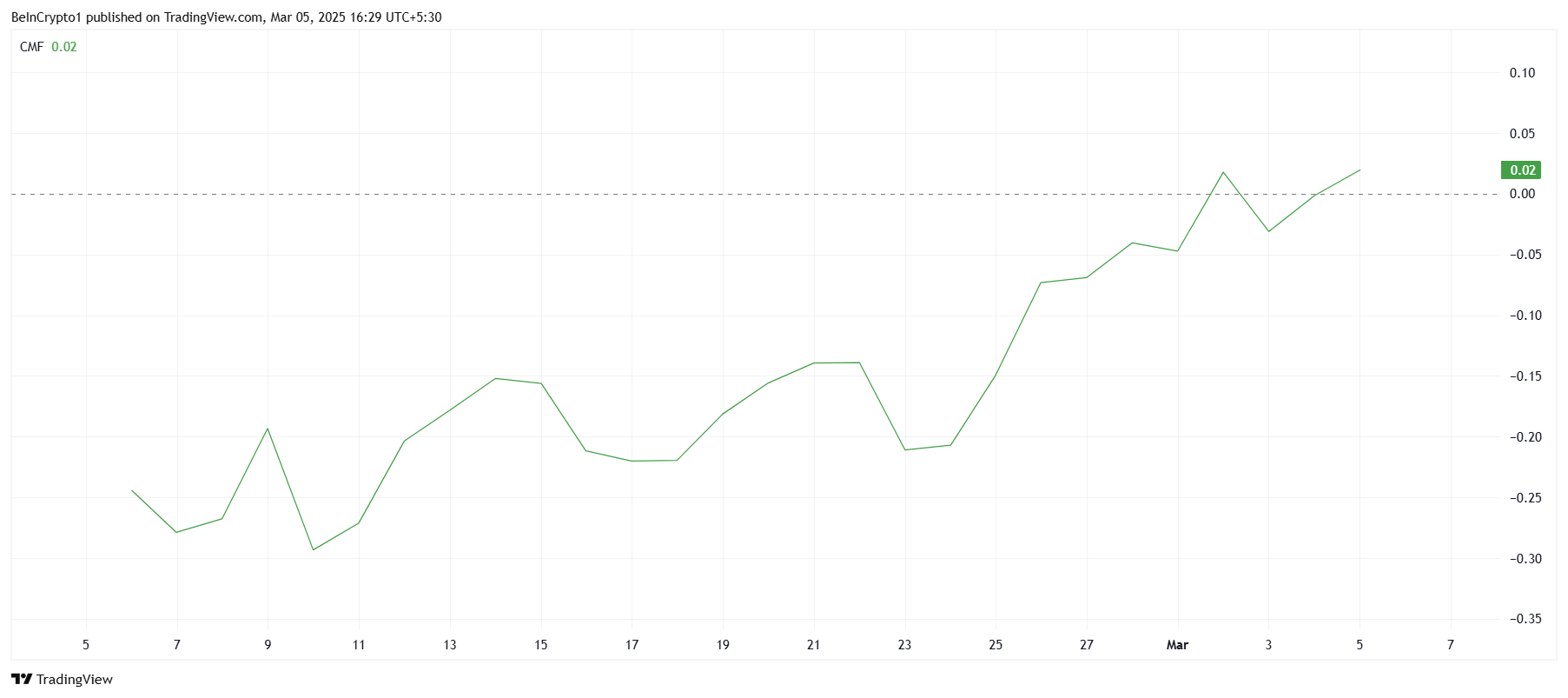Chaikin Money Flow (CMF) indikatori TRUMP uchun ijobiy belgilarni ko’rsatmoqda, indikator hozirda nol chizig’idan yuqorida. Bu kirishlar chiqishlardan kuchliroq ekanligini ko’rsatadi, bu esa investorlar altcoinning kelajagiga optimistik ekanligini anglatadi.
