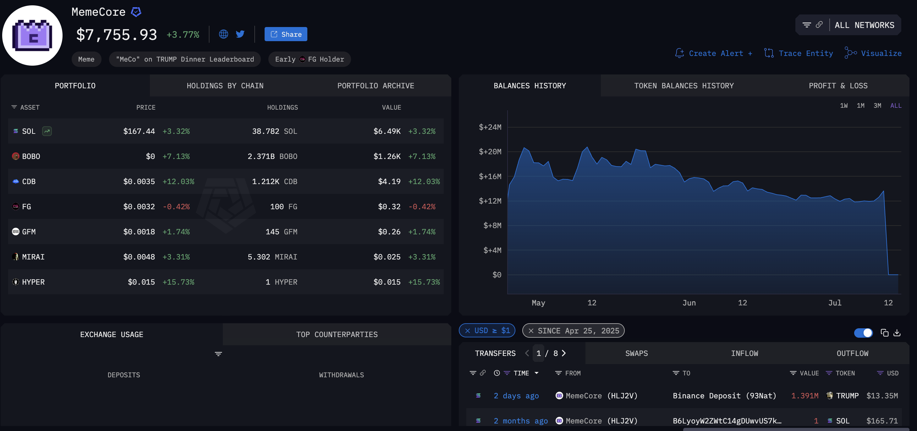 Bu voqea bilan bir vaqtda, bozor katta miqdordagi sotuvlarni ko’rmoqda. «Arkham Intel» ma’lumotlariga ko’ra, «MemeCore» yaqinda 1,391 million «TRUMP»ni, qiymati 13,35 million dollar, «Binance»ga o’tkazdi. Bu katta hamyonlar ochilishdan oldin likvidatsiya qilayotganining birinchi belgisi bo’lishi mumkinmi?