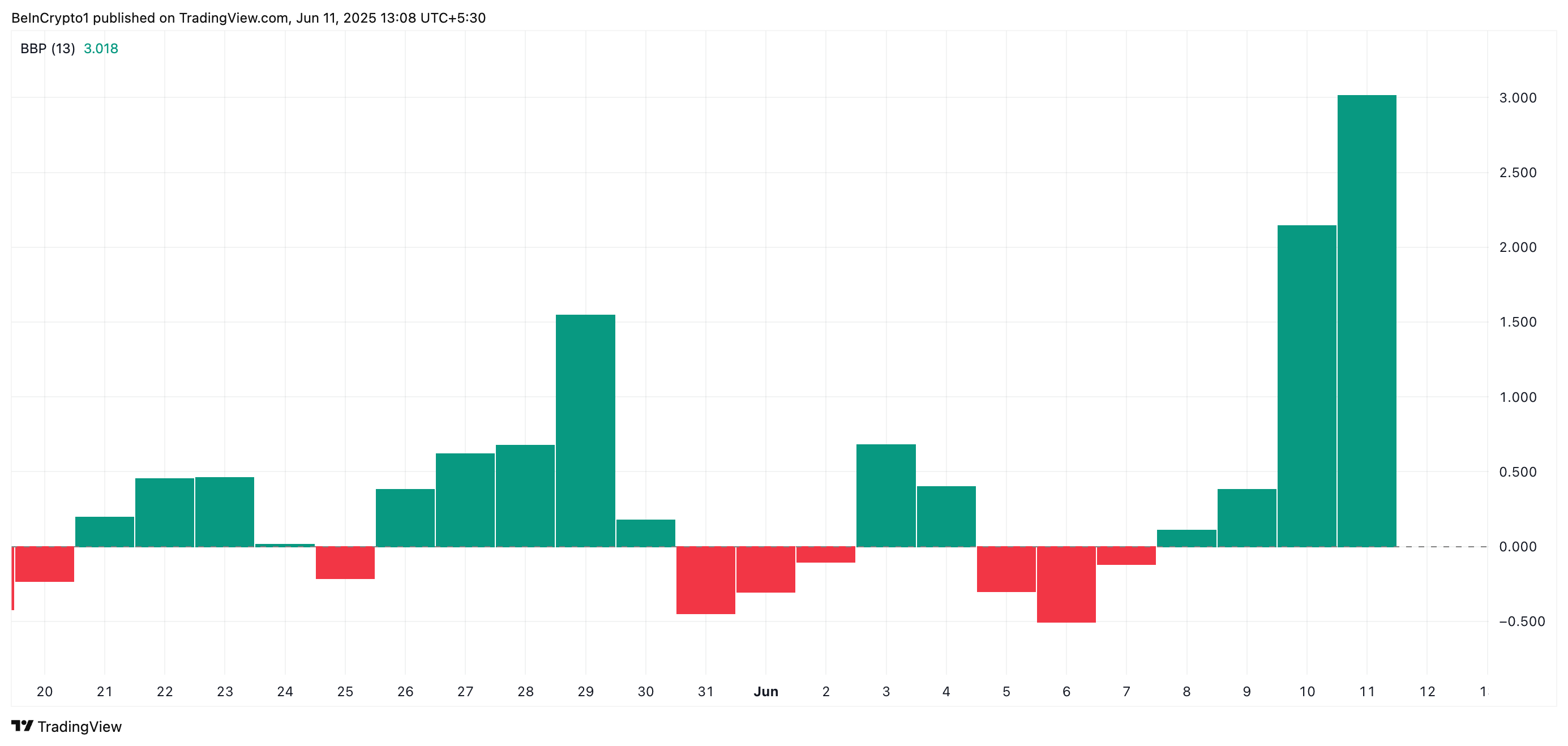 Bu ko’rsatkich bozoridagi buqalar va ayiq kuchini o’lchaydi. Agar yashil histogramma ustunlari paydo bo’lsa, bu kuchli xaridorlar ustunligini va yuqoriga harakatlanish tendensiyasini ko’rsatadi. Bu UNI ning qisqa muddatli o’sishini davom ettirish ehtimolini bildiradi.