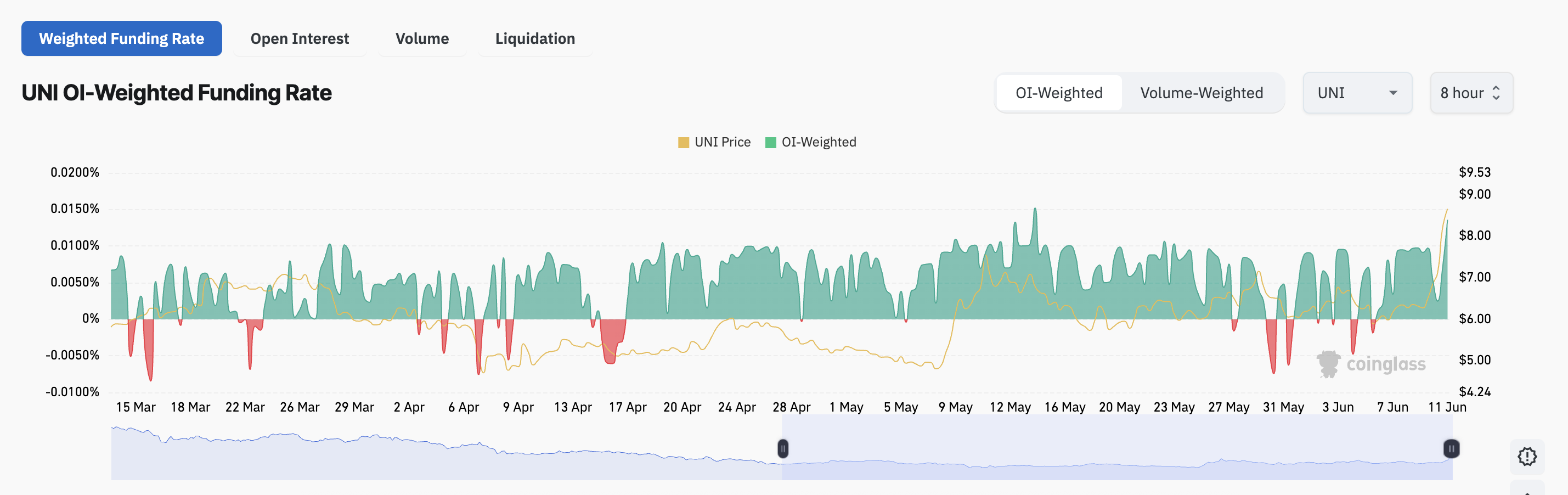 UNI/USD bir kunlik jadvalini tahlil qilish shuni ko’rsatadiki, altkoin 10-iyun kuni 40% ga o’sib, to’rt oylik eng yuqori daraja – $8.66 ga yetdi. Garchi u keyinchalik qisqa muddatli pasayishni boshdan kechirgan bo’lsa-da va hozirda $8.38 da savdo qilayotgan bo’lsa-da, UNI so’nggi kun ichida 17% ga o’sdi va buqa bozorining kuchayishi davom etmoqda.