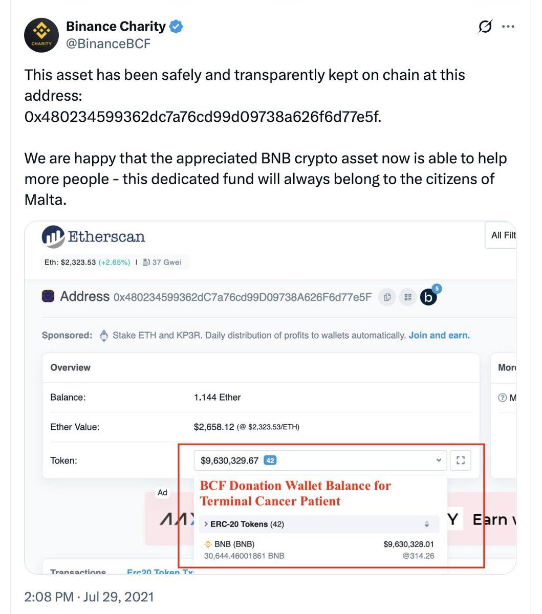 2018-yilda 200,000 AQSh dollari qiymatida bo’lgan kripto xayriya, bugungi kunda 39 million dollarga yetdi, lekin BNB hali ham Maltaning terminal rak fondi uchun hamyonda saqlanmoqda.