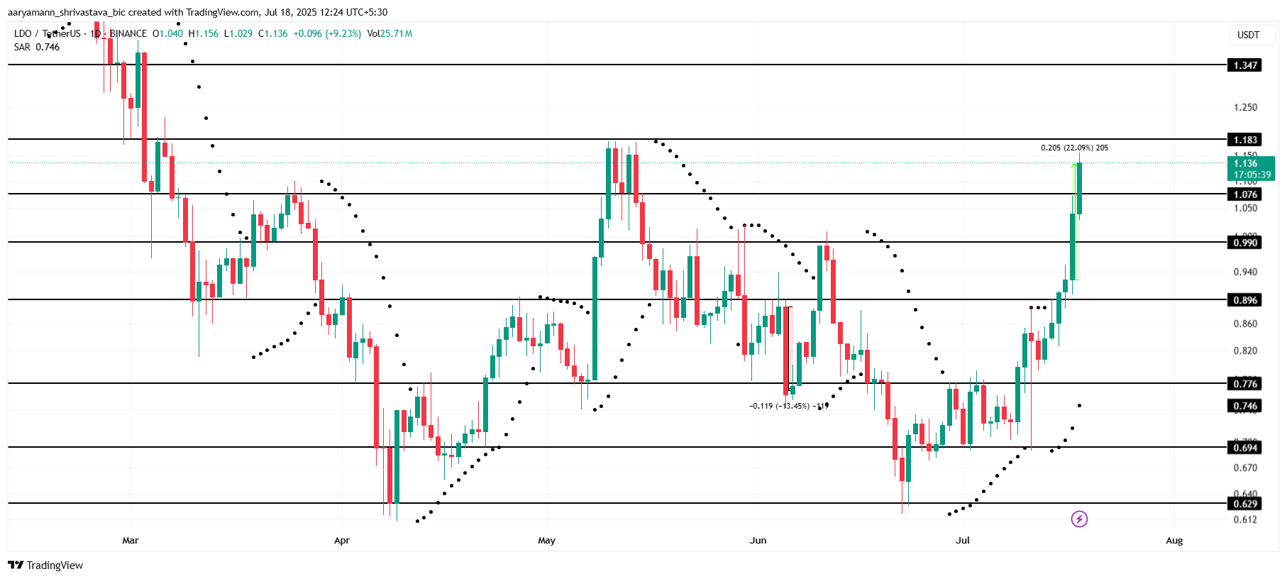 Ushbu e’lon LDOni dam olish kunlariga yanada ko’tarishi kutilmoqda. Narx $1.18 qarshilik darajasidan oshib ketishi mumkin. Parabolik SAR indikatorining shamlar ostida kuchli qo’llab-quvvatlashni ko’rsatishi bilan, LDO $1.34 ga ko’tarilishi mumkin. Bu to’rt oylik yuqori darajani belgilaydi. Ushbu o’sish tendensiyasi token uchun davom etayotgan ijobiy harakatni ko’rsatadi.