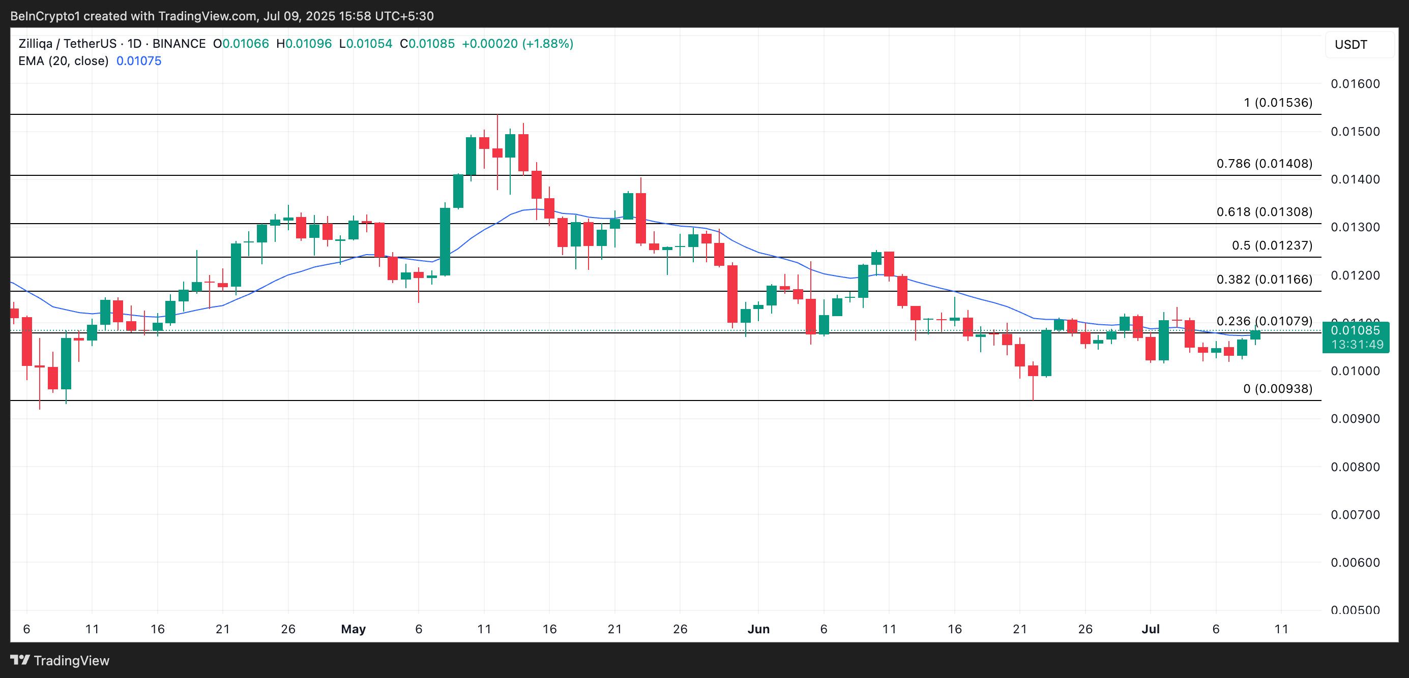 ZIL $0.0108 da savdo qilmoqda, so’nggi yetti kun ichida 4% narx o’sishini qayd etdi. Uning barqaror o’sishi narxni 20 kunlik eksponensial harakatlanuvchi o’rtacha (EMA) dan yuqoriga ko’tardi.