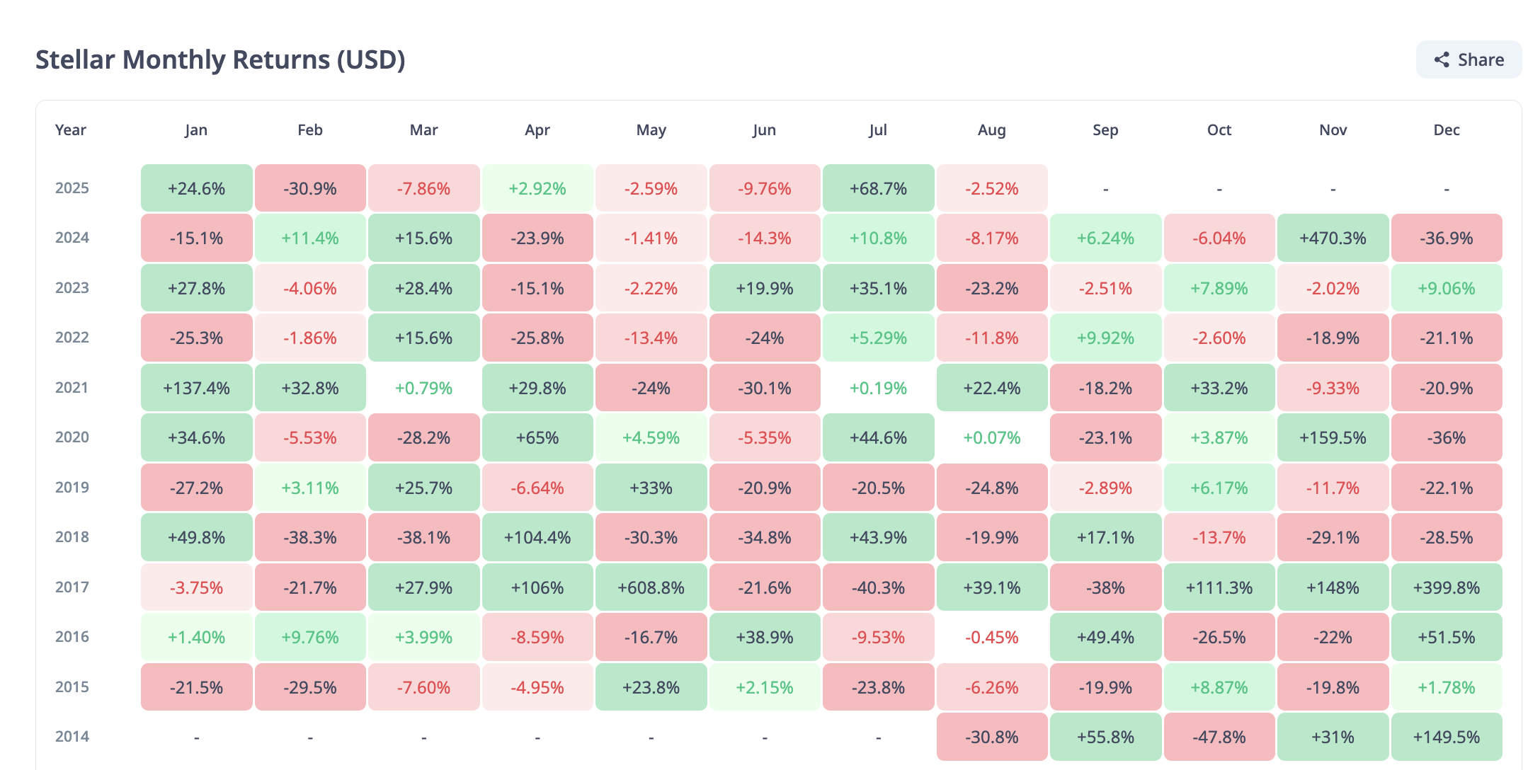 XLMning oylik daromadlarini tahlil qilish xavotirli naqshni ko’rsatadi. Avgust oyida faqat ikki marta, 2017 va 2021 yillarda, ijobiy oylik yopilish bo’lgan. Boshqa barcha avgustlar qizil rangda tugagan.