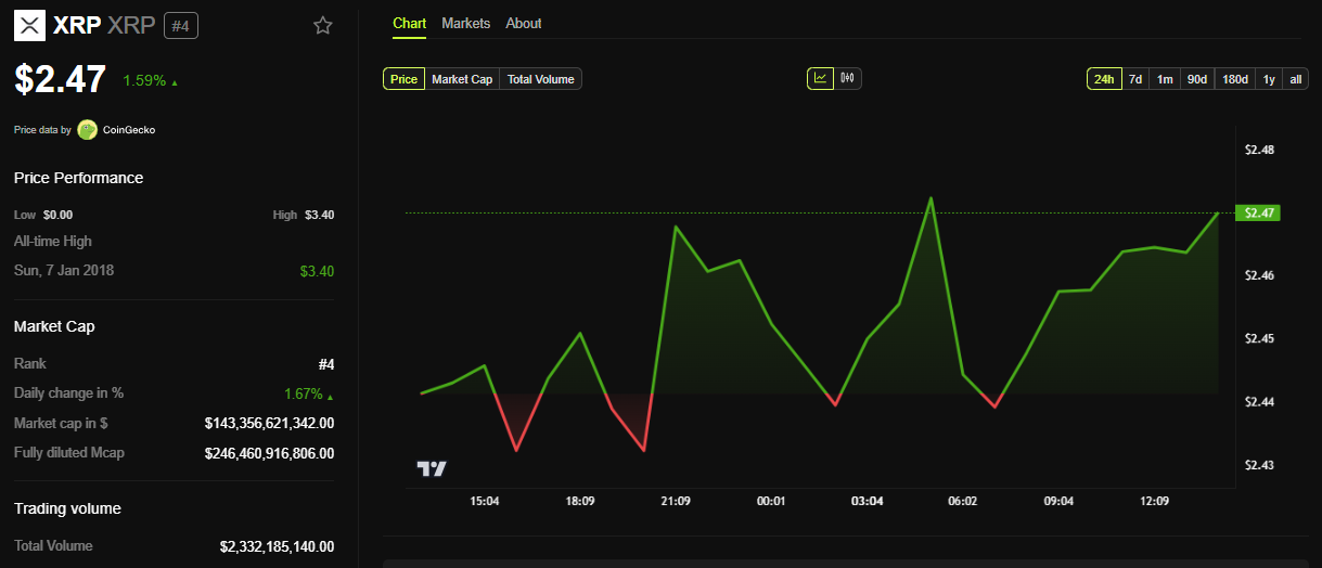 BeInCrypto ma’lumotlariga ko’ra XRP ushbu yozuv paytida $2.47 ga savdo qilinmoqda. Bu so’nggi 24 soat ichida deyarli 2% lik ozgina o’sishni anglatadi.