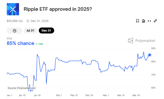 Fevral oyidan boshlab, SEC XRP ETF arizalarini ko’rib chiqish uchun 240 kunlik hisoblashni boshladi, tasdiqlash ehtimoli sezilarli darajada oshdi. Polymarket ma’lumotlariga ko’ra, 2025 yilda XRP ETF tasdiqlanish ehtimoli 82% ga ko’tarildi. Shu bilan birga, 2025 yil 31 iyulga qadar tasdiqlanish ehtimoli 41% ni tashkil etadi.