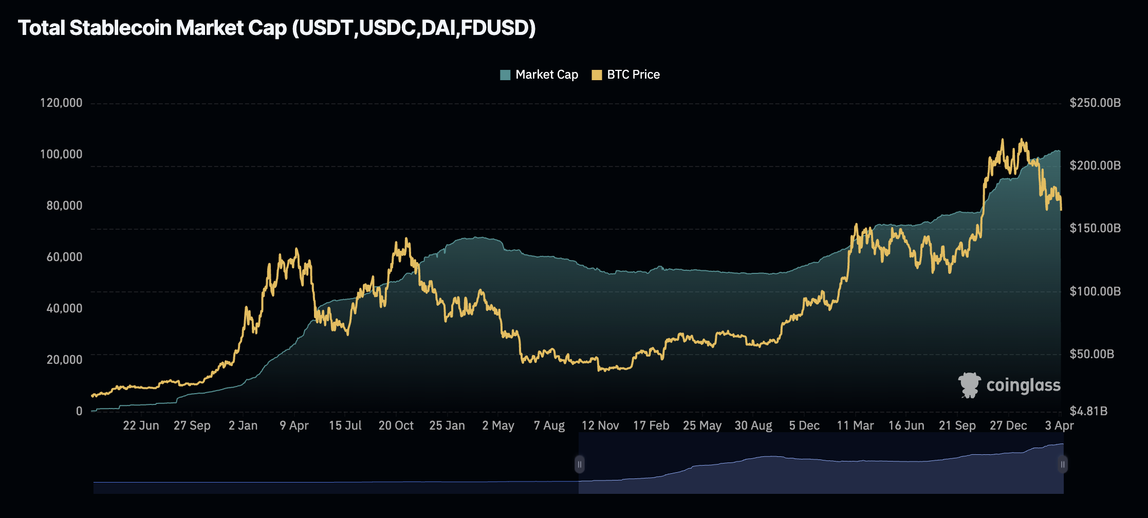Stablecoinlarning umumiy bozor kapitallashuvi hozirda o’zining eng yuqori darajasiga yaqin, 210 milliard dollardan yuqori.