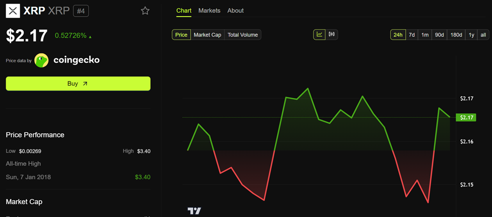 Yozish vaqtida XRP $2.17 da savdo qilmoqda, so’nggi 24 soatda 0.5% dan ko’proq o’sdi. Kichik o’sishlarga qaramay, «CoinGecko» ma’lumotlari ko’rsatmoqdaki, «Ripple» tokeni bozor kapitallashuvi bo’yicha eng yirik altkoinlar orasida juma kuni eng ko’p o’sganlardan biri bo’ldi.