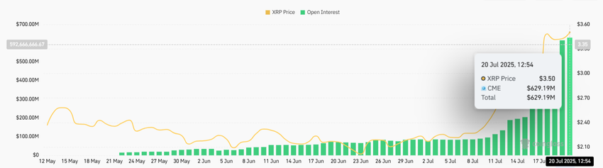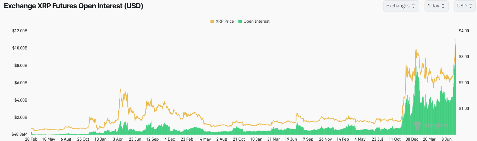 «CoinGlass» ma’lumotlariga ko’ra, XRP doimiy fyucherslaridagi ochiq foizlar $11 milliarddan oshib ketdi, bu taxminan 3,1 milliard tokenni o’z ichiga oladi.