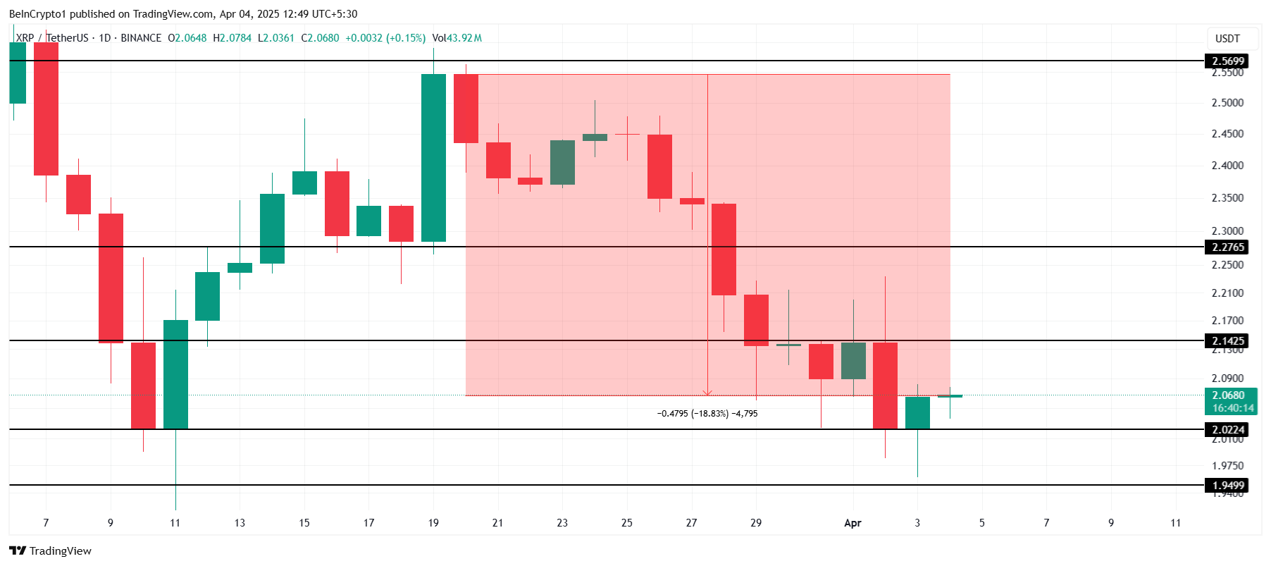 XRP narxi hozirda $2.06 da ushlab turibdi, bu $2.02 asosiy qo’llab-quvvatlash darajasidan biroz yuqorida. Agar u barqarorlashib, $2.14 darajasidagi darhol qarshilikni yengib o’tsa, XRPni yuqoriga ko’taradigan potentsial qayta tiklanish bo’lishi mumkin.