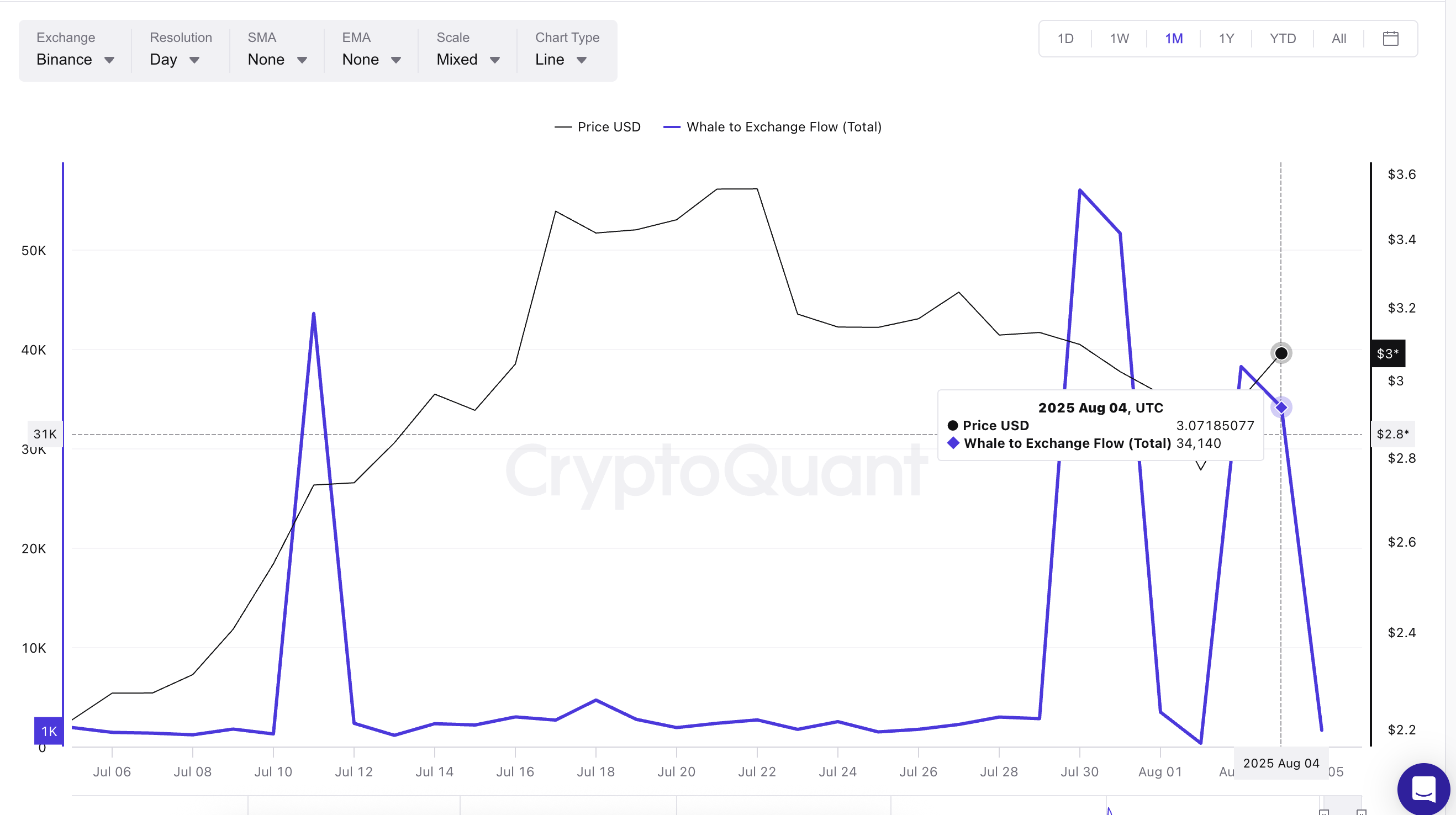 Qiziqarli tomoni shundaki, kitlar ham bu harakatda rol o’ynashi mumkin. Kitlardan birjalarga kirimlar ma’lumotlari katta egalarning o’tgan o’sishlar davomida agressiv sotganini ko’rsatadi. 30-iyulda kit kirimlari 55,000 XRP dan oshdi, bu bir oy ichidagi eng yuqori daraja edi, o’shanda XRP narxi $3.00 dan pastga tushdi. Yana, 3-avgustda kirimlar 38,226 XRP ga yetdi, narx $3.00 ga yaqinlashganda.