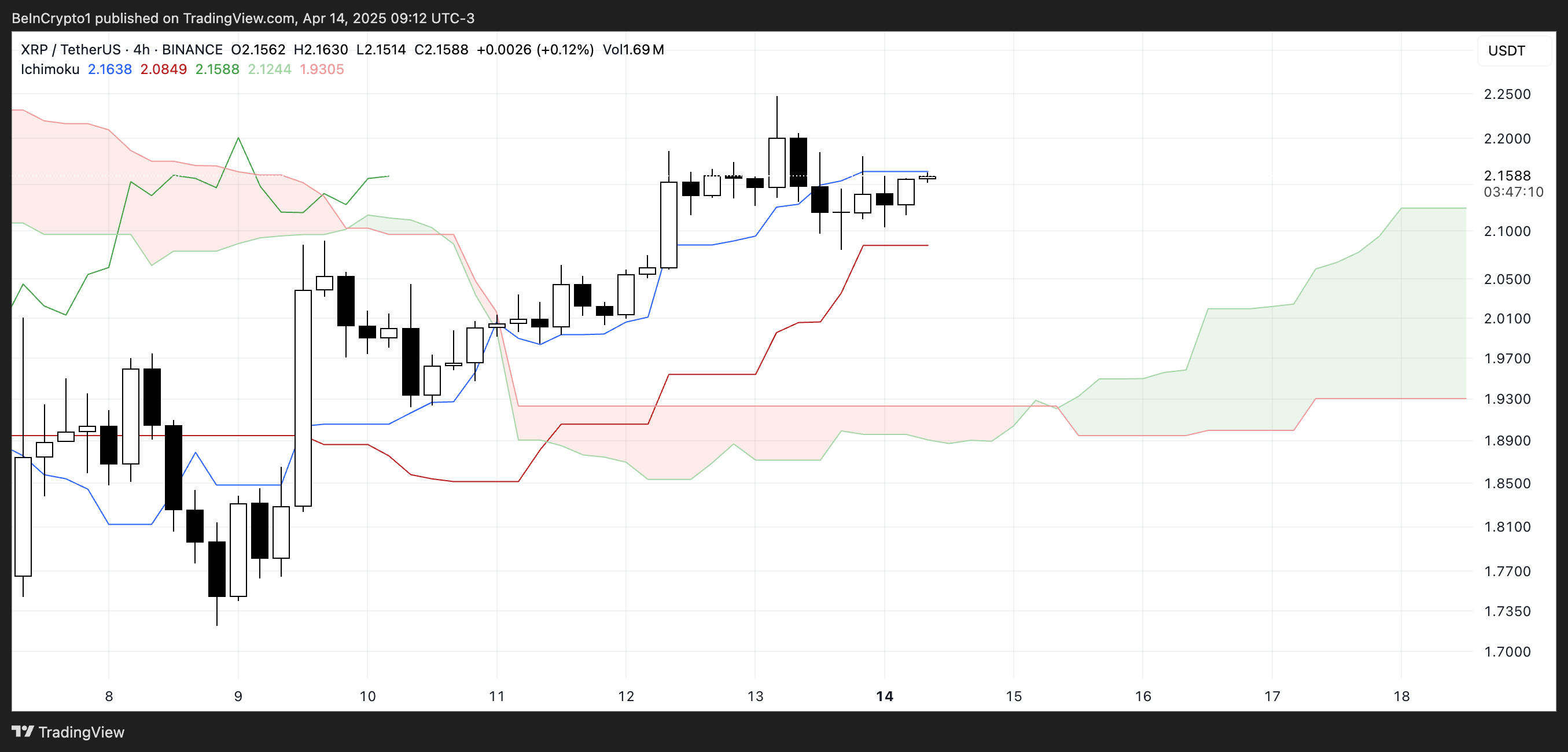 XRP uchun Ichimoku buluti hozirda ijobiy holatni ko’rsatmoqda, narx ko’k konversiya chizig’i (Tenkan-sen) va qizil asos chizig’i (Kijun-sen) ustida joylashgan.
