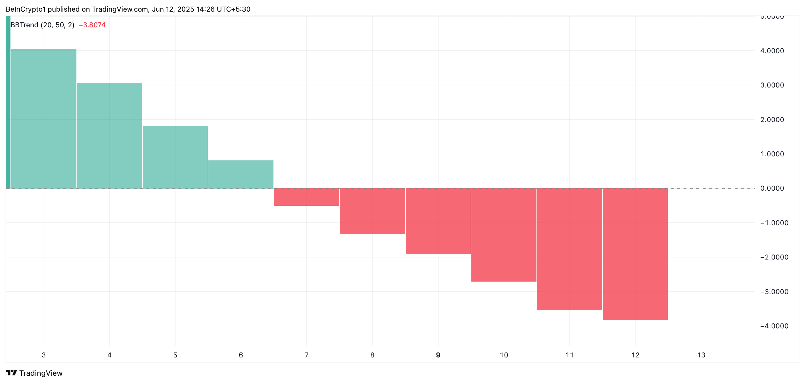 BBTrend indikatori Bollinger Bantlarining kengayishi va qisqarishiga asoslangan holda trendning kuchi va yo’nalishini o’lchaydi. Qizil chiziqlar paydo bo’lganda, aktiv kuchli pasayish tendensiyasini va o’rtacha harakatlanuvchi qiymatdan pastda o’zgaruvchanlikni boshdan kechirmoqda.