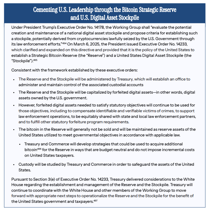 Qisqa doirada Moliya vazirligi tomonidan faqat musodara qilingan hukumat Bitkoinlarini boshqarish ko’zda tutilgan. Ushbu zaxiralar odatda sotilmaydi, balki strategik zaxira aktivlari sifatida saqlanadi. Biroq, hisobotda qo’shimcha Bitkoin sotib olish rejalari haqida aniq ma’lumotlar yo’q.