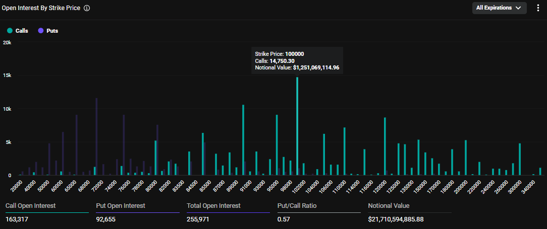 Deribit ma’lumotlari ushbu kuzatuvni tasdiqlaydi, $ 100,000 qo’ng’iroq strike narxi ushbu yozuvdan boshlab eng mashhur qo’ng’iroq varianti bo’lganligini ko’rsatib, eng yuqori ochiq qiziqishni qayd etadi T s Bitcoin ushbu psixologik bosqichga yaqinlashishi mumkin bo’lgan bahslarni taklif qiladi.