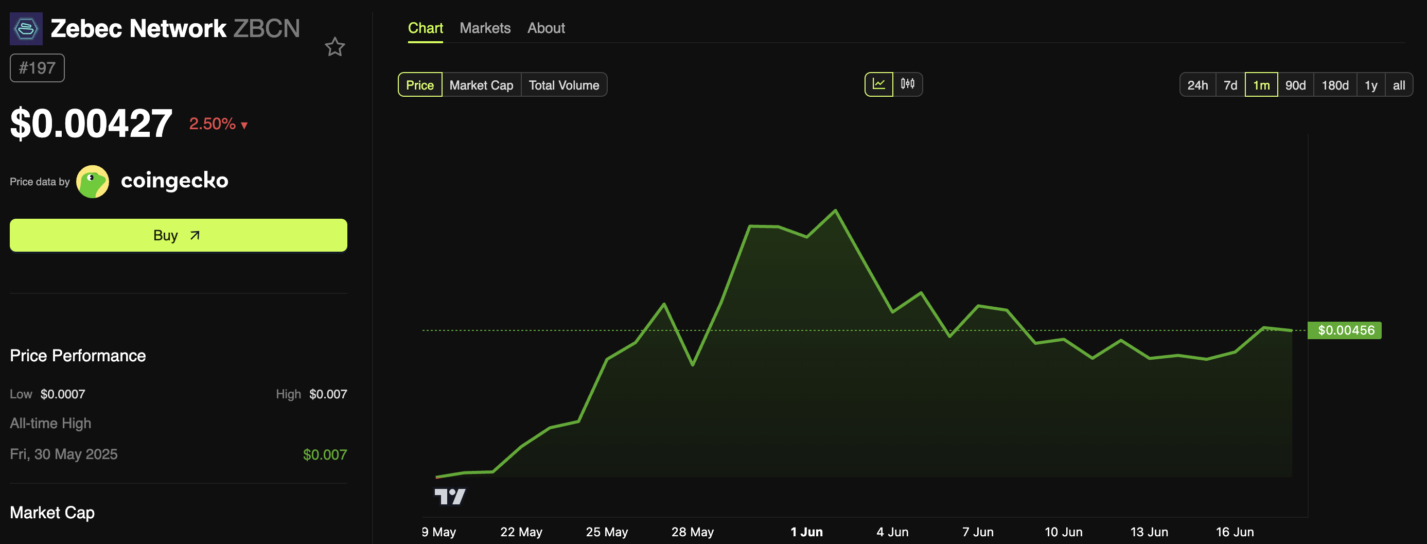 «BeInCrypto» ma’lumotlariga ko’ra, so’nggi 14 kun ichida altkoin 13.6% ga pasaygan. Ushbu maqola yozilayotgan paytda, ZBCNning savdo narxi 0.004 edi, so’nggi 24 soat ichida 2.5% ga pasaygan.