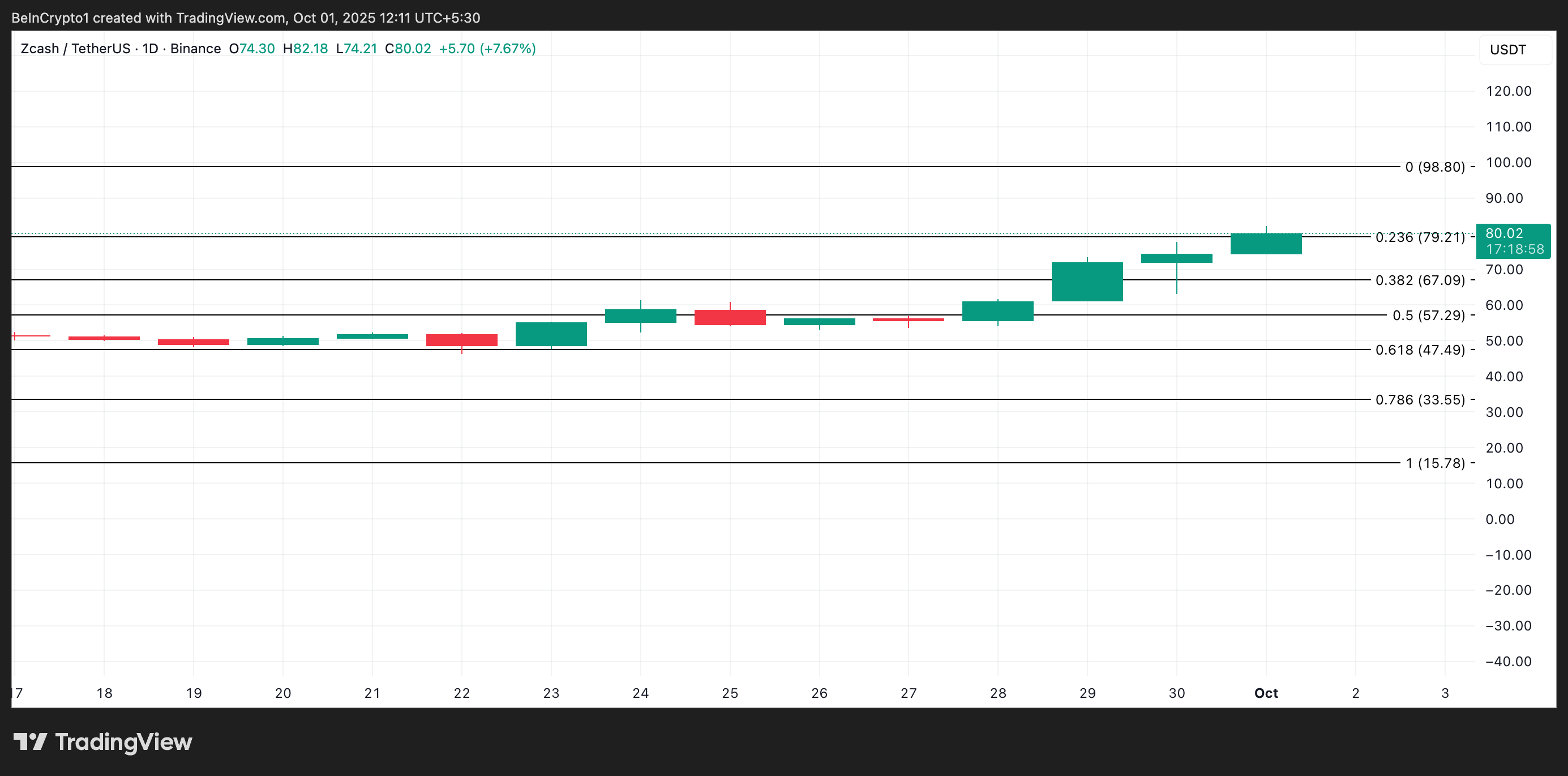 Matbuot vaqtida, «ZEC» 79.21 dollarlik asosiy qo’llab-quvvatlash darajasi yaqinida savdo qilmoqda. Agar talab davom etsa va bu narx darajasi mustahkamlanib borsa, tokenning narxi 98.80 dollarga ko’tarilishi mumkin.