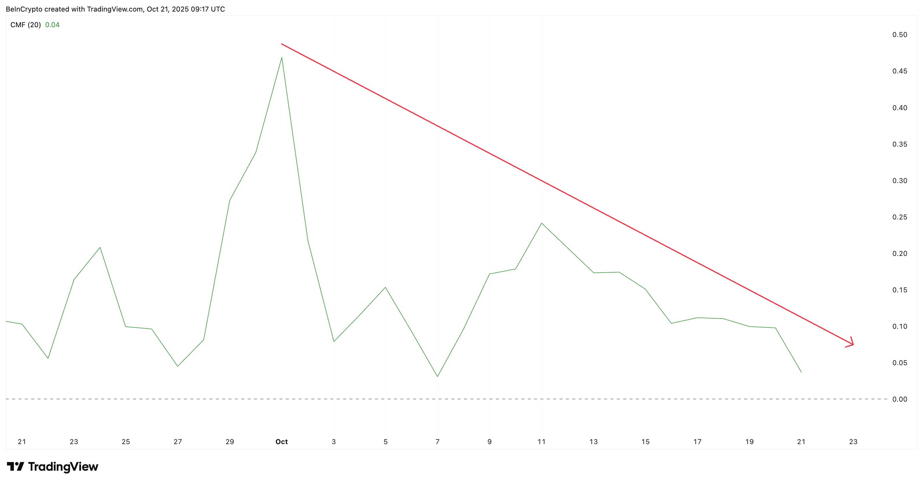 Katta investorlar o’z xaridlarini sekinlashtira boshladilar. Chaikin Money Flow (CMF) — katta pul oqimlarini o’lchaydigan indikator — oktyabr boshida 0.45 dan hozirda 0.04 ga keskin tushdi. Bu ZECning avvalgi o’sishini boshqargan katta investorlar foyda olishni boshlaganini ko’rsatadi.