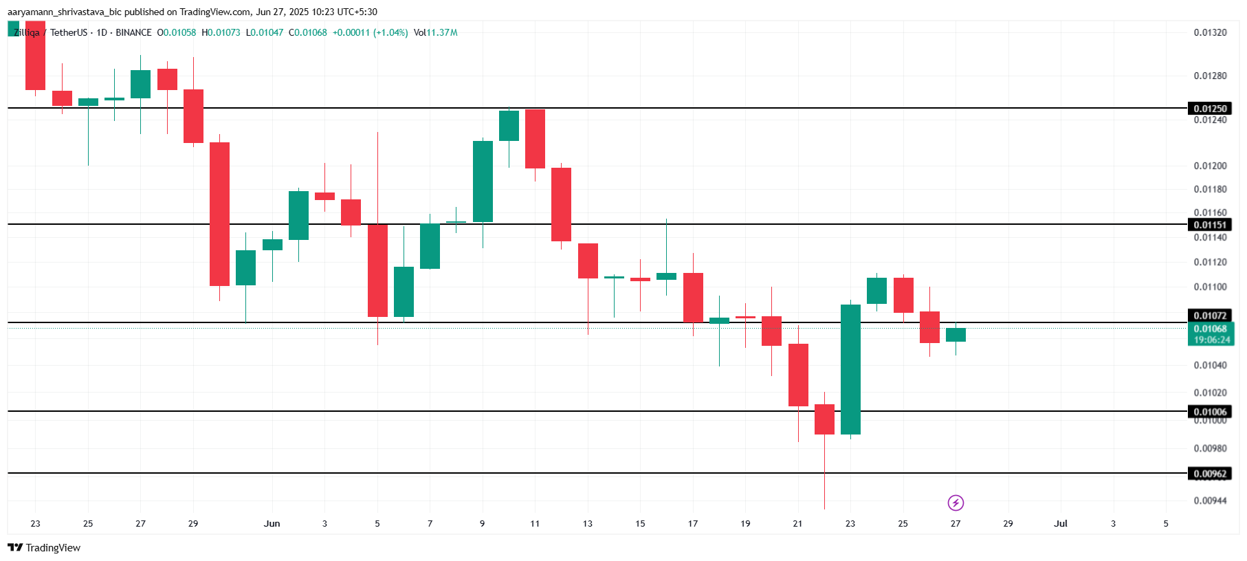 Biroq, agar ayirbosh bozor sharoitlari hozirgi ijobiy hissiyotlarni yengib o’tsa, «Zilliqa»ning narxi $0.0100 ga tushishi mumkin. Ushbu darajaga tushish ijobiy prognozni bekor qiladi, so’nggi yutuqlarni yo’q qiladi va narxni yana konsolidatsiya bosqichiga qaytaradi. Investorlar bozor sharoitlarini diqqat bilan kuzatib borishlari kerak, ijobiy sur’at saqlanib qoladimi yoki yo’qmi, aniqlash uchun.