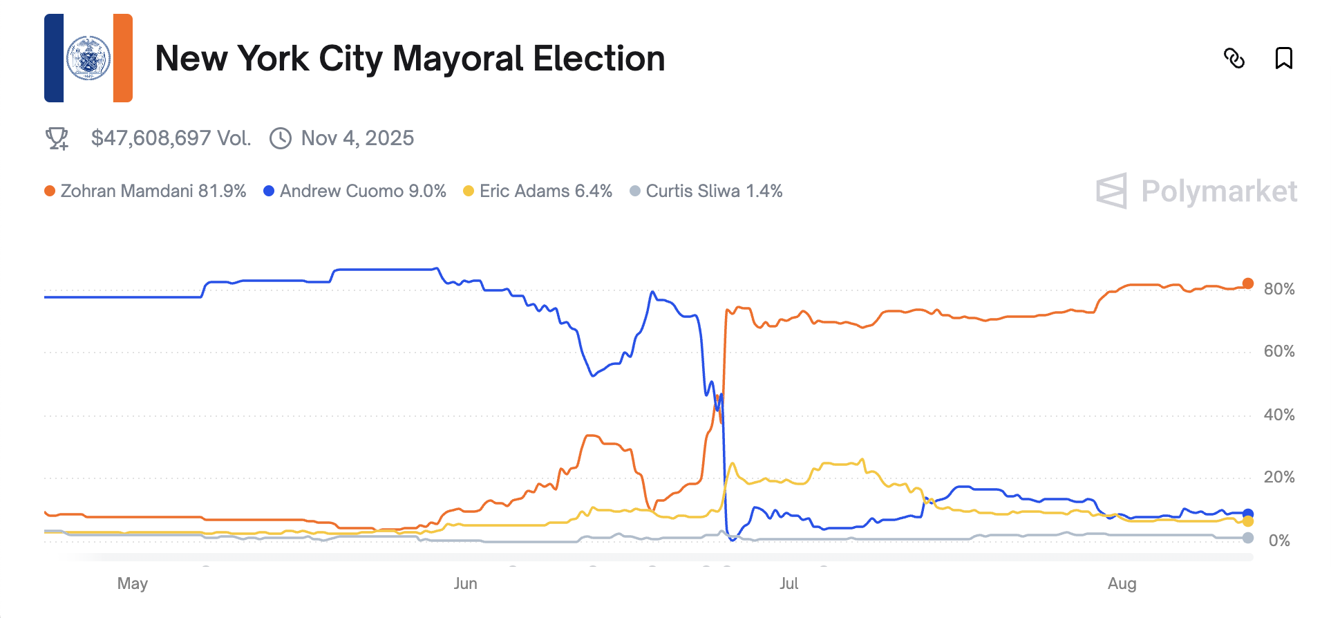 Zohran esa, «Polymarket»ning bu saylovda g’olib bo’lish uchun katta ehtimoliy nomzodi hisoblanadi. Agar u bu yo’ldan davom etsa va g’alaba qozonsa, butun mamlakat bo’ylab boshqa nomzodlar ham kriptovalyutaning siyosiy korrupsiyaga aloqadorligini tanqid qilishda davom etishi mumkin.